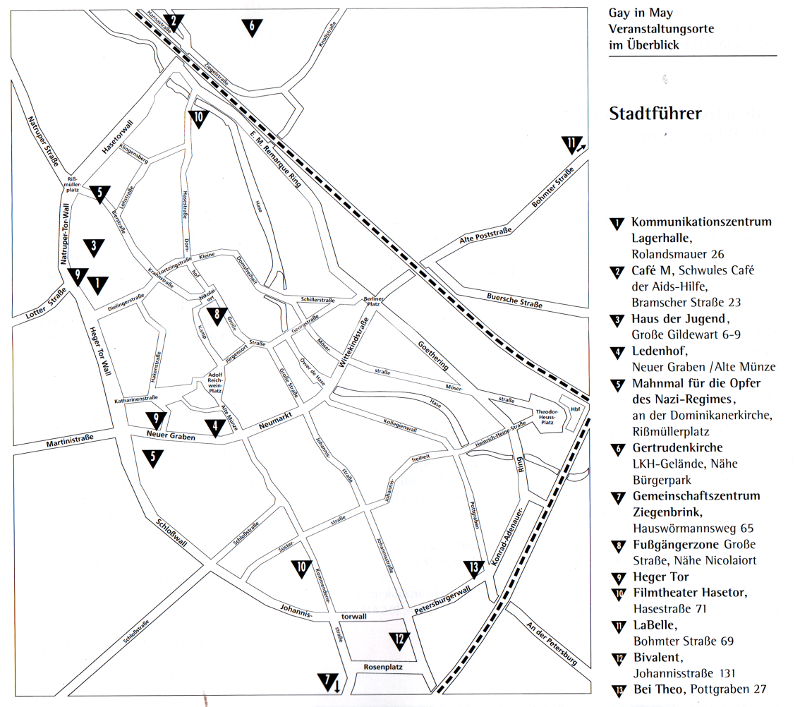In der Innenstadt verteilte Veranstaltungsorte von Gay in May 1994 (Programmheft Gay in May 1994, Projektarchiv VHM)